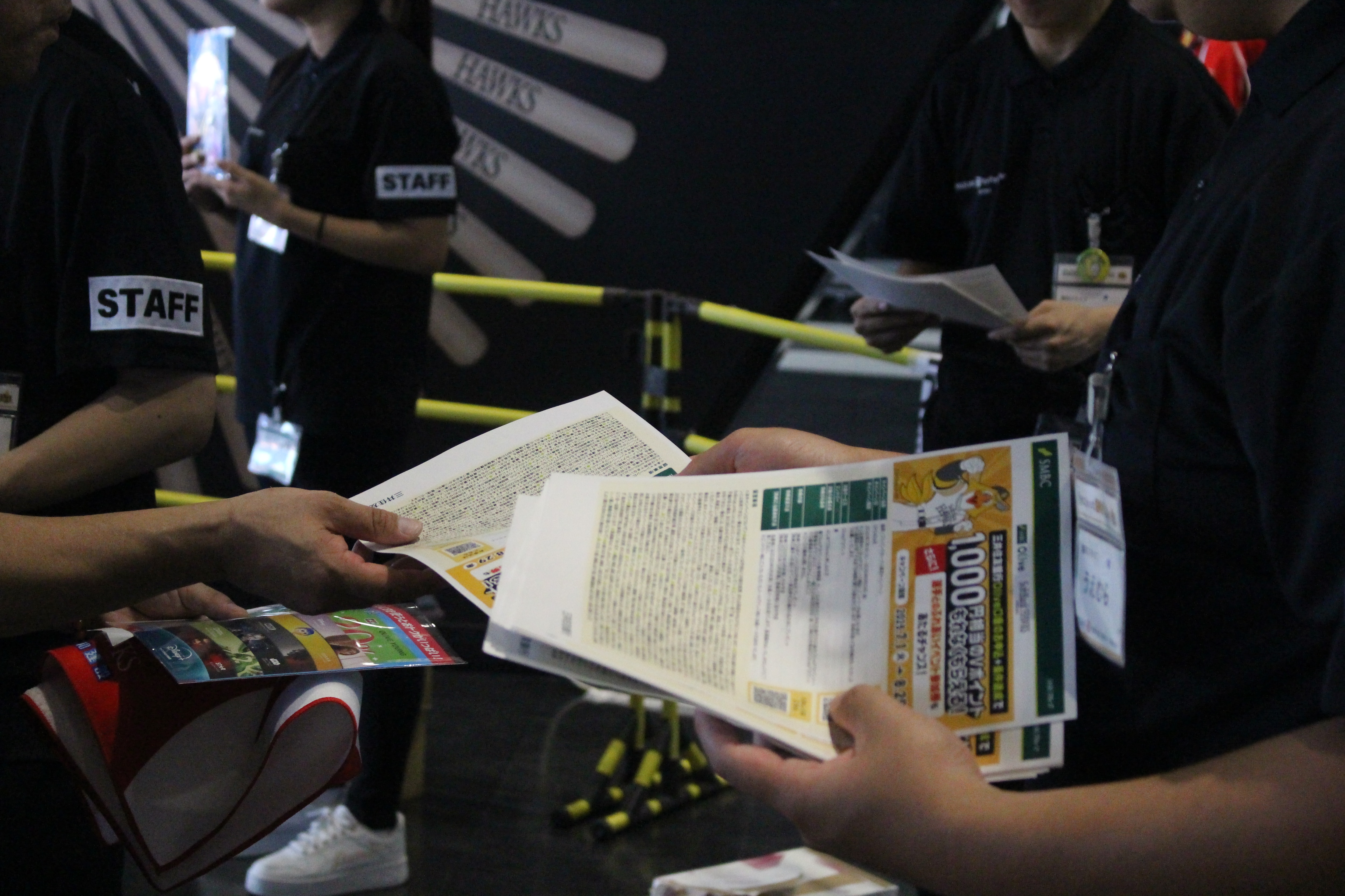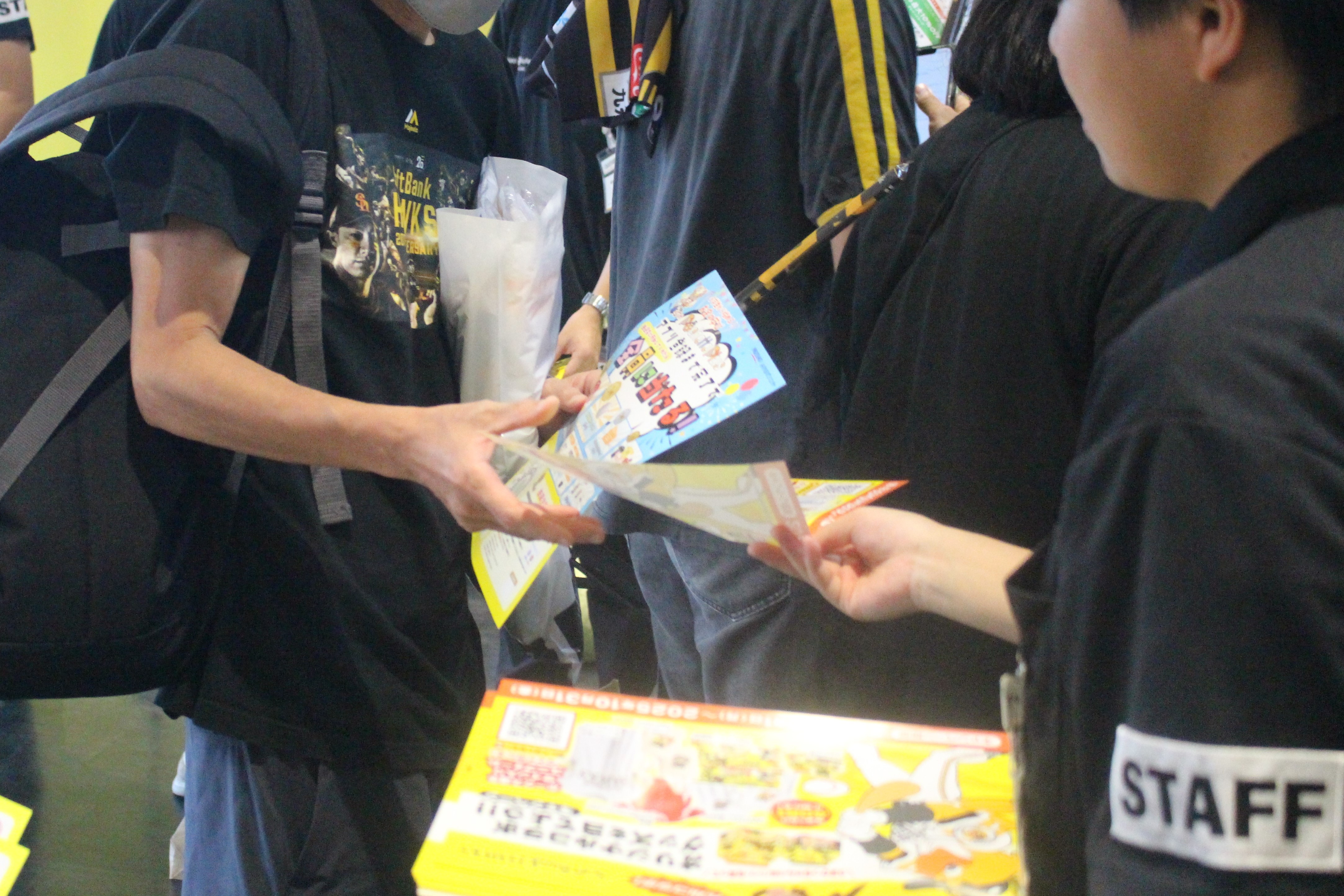 株式会社リンガーハットは、「リンガーハット」と「とんかつ濵かつ」が福岡ソフトバンクホークスとコラボレーションした「食べて当てよう応援キャンペーン」の開催に合わせ、来場者へキャンペーンの案内チラシを配布しました。