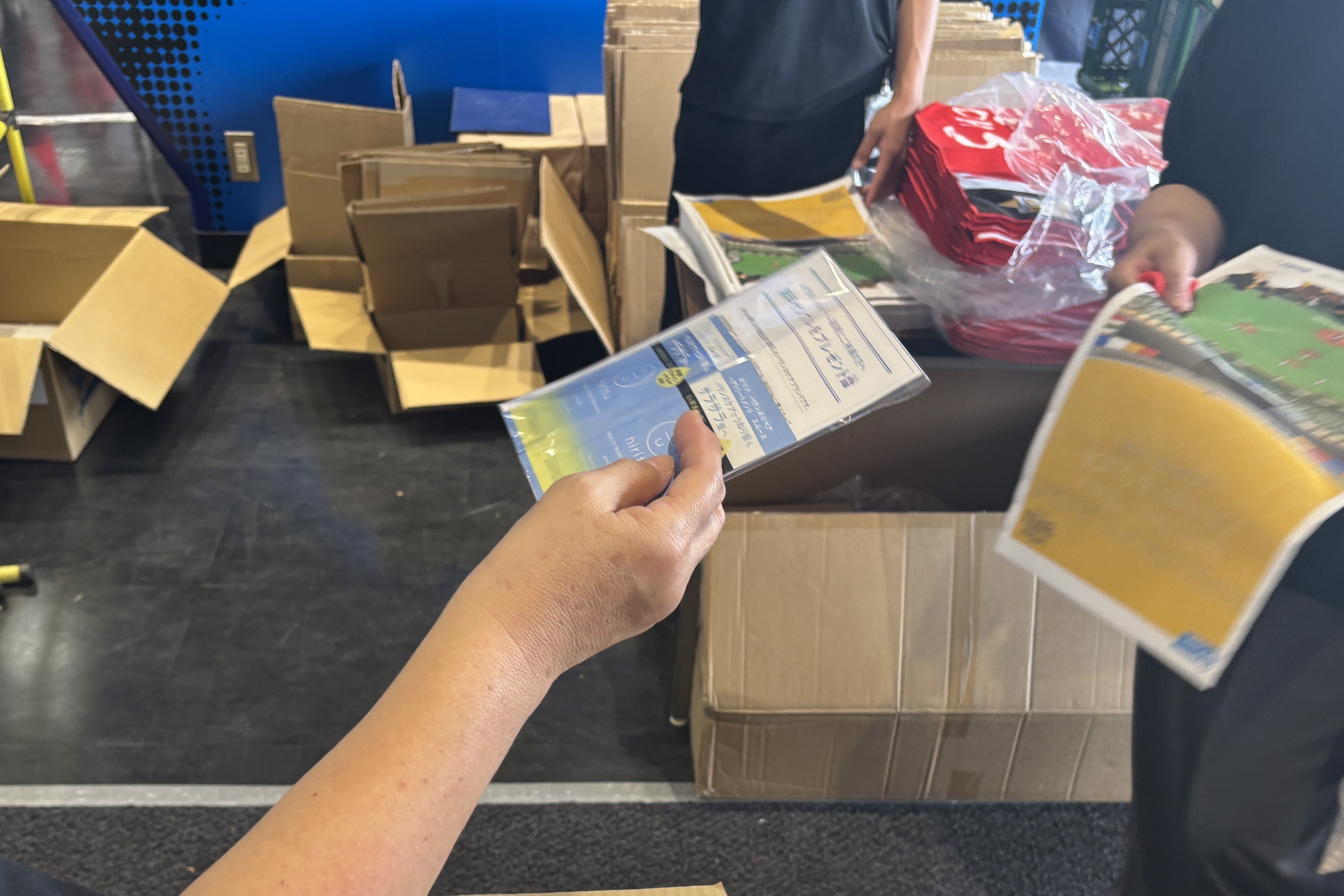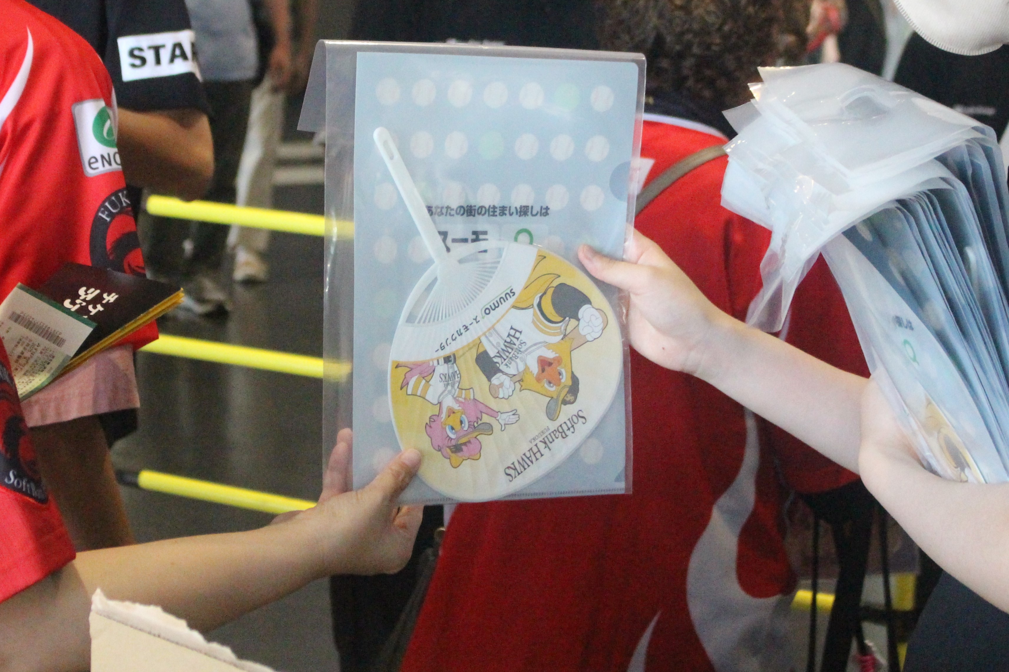 当日、みずほPayPayドームの来場者には、「あなたの街の住まい探しはスーモ」と記載されたクリアファイルやオリジナルうちわなどが配布されました。