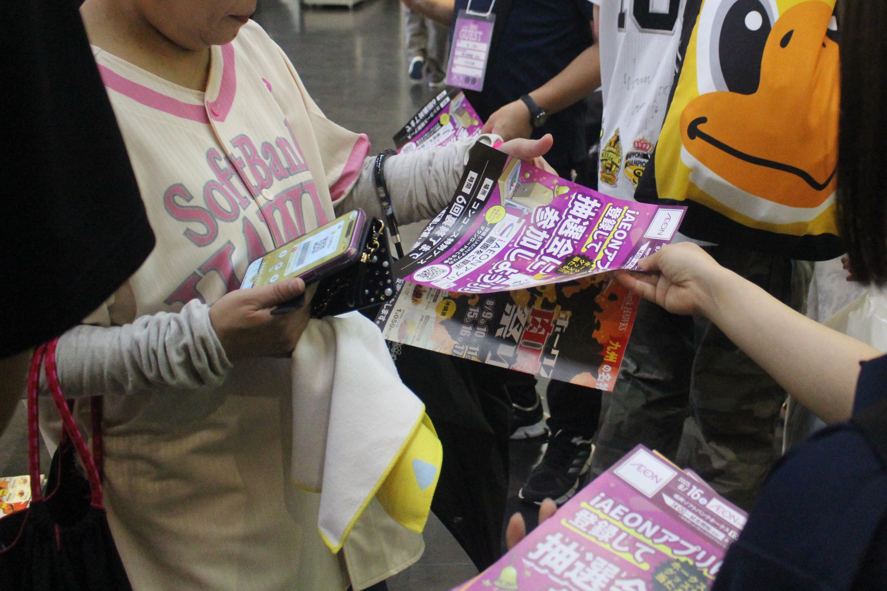 イオン九州株式会社は、PayPayドームの来場者を対象に、「iAEONアプリ」 への登録を促すチラシを配布しました。アプリに登録すると、ホークス選手のサインボールが当たる抽選会に参加できるイベントも同時に実施されてます。