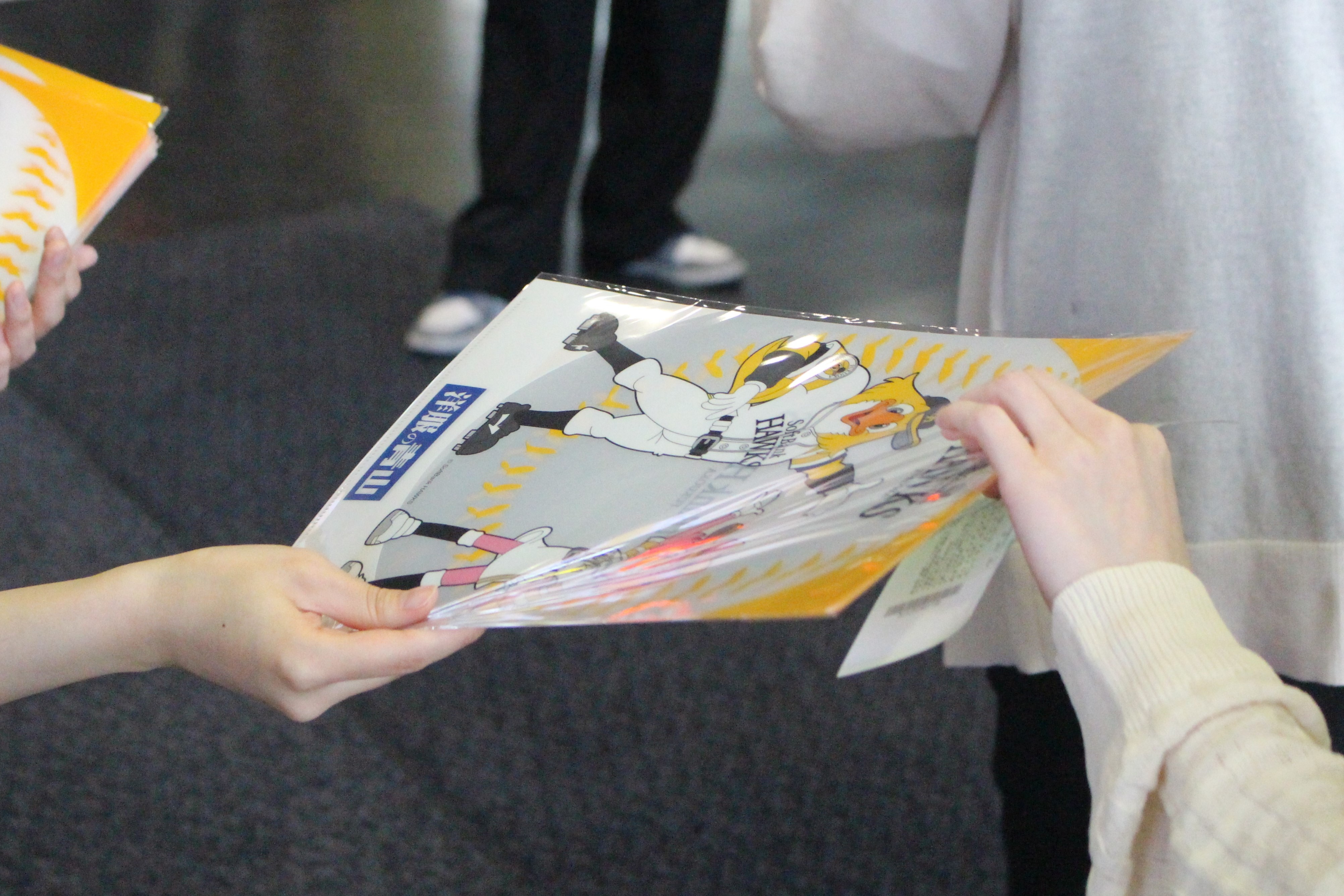 クリアファイルには、球団マスコットであるハリーホークとハニーホークのデザインが施されており、ホークスファンに喜んで手に取ってもらい、日常的に使用してもらう工夫がされています。