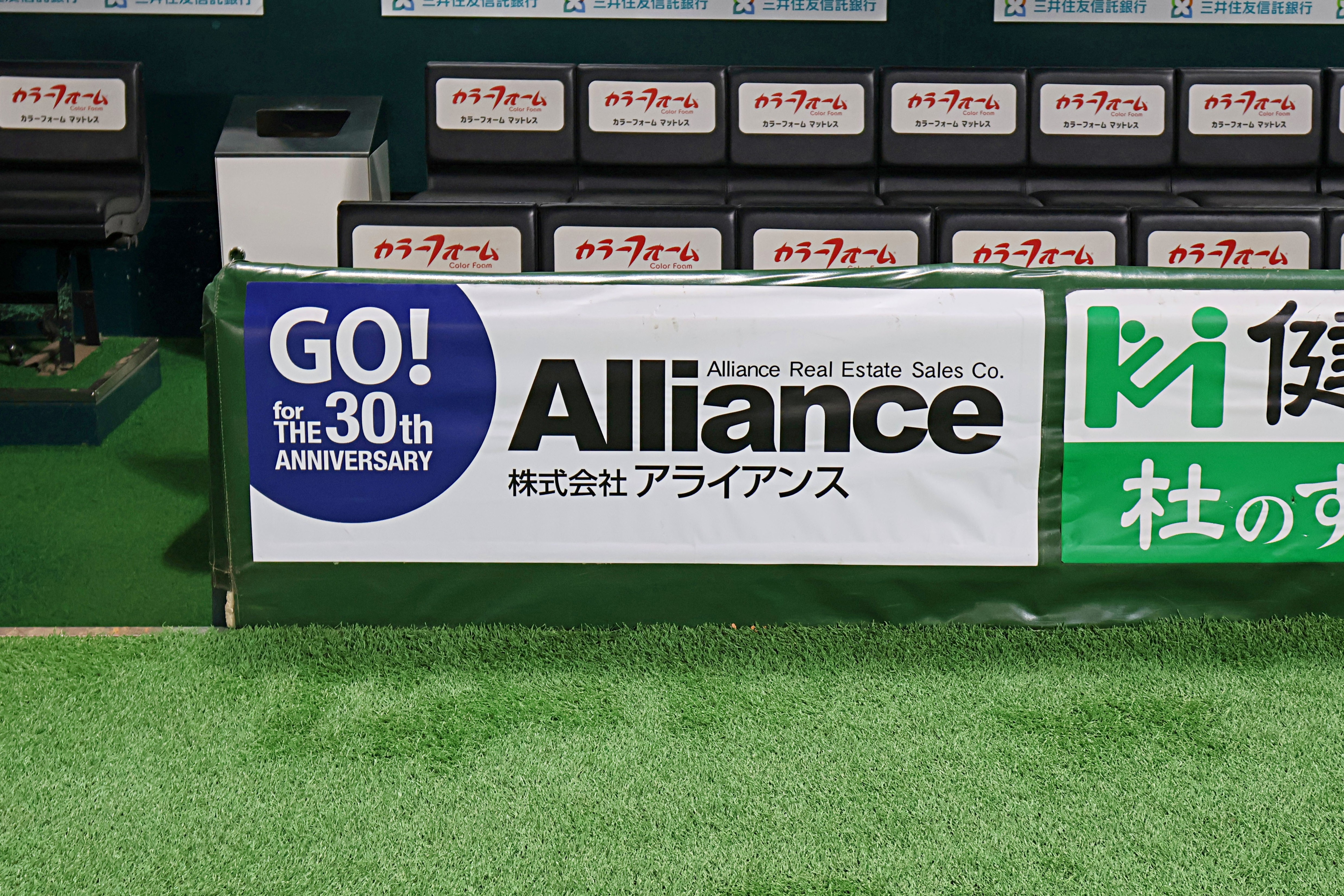 得点シーンや選手の表情が抜かれるタイミングで映り込むのが、ベンチ前の防球ネット広告です。周年記念のロゴや新コピーを載せることで、“感情が動く瞬間”と“周年メッセージ”をセットで届けられます。