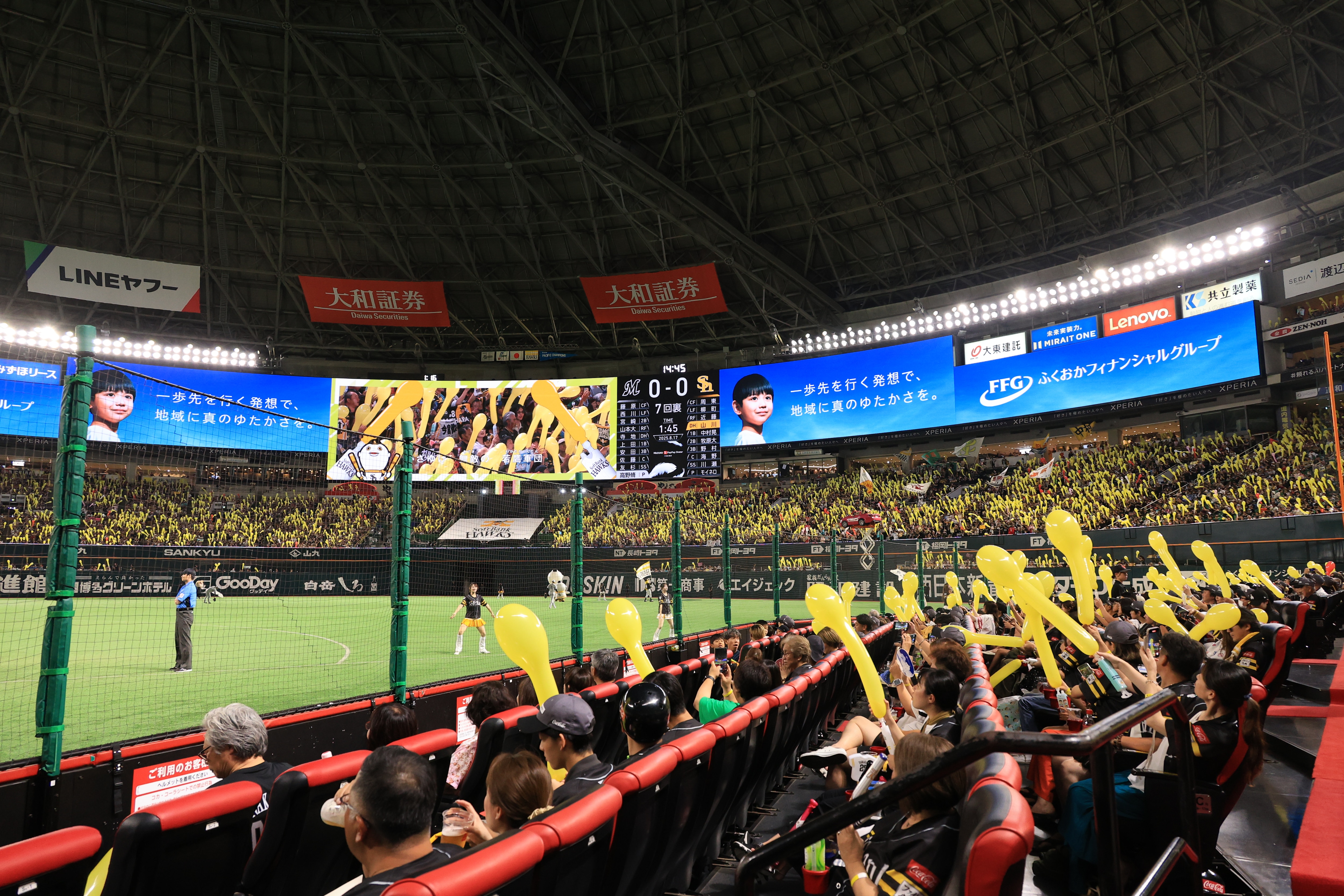 みずほPayPayドームのビジョン広告で、来場者に対しSDGs活動を広くPRするほか、宮崎春季キャンプでのエコステーション設置による資源リサイクルを推進。毎年恒例の「ホークスセール」と合わせ、企業の社会的責任を果たす姿勢をファンや地域住民へ強力に印象づけています。