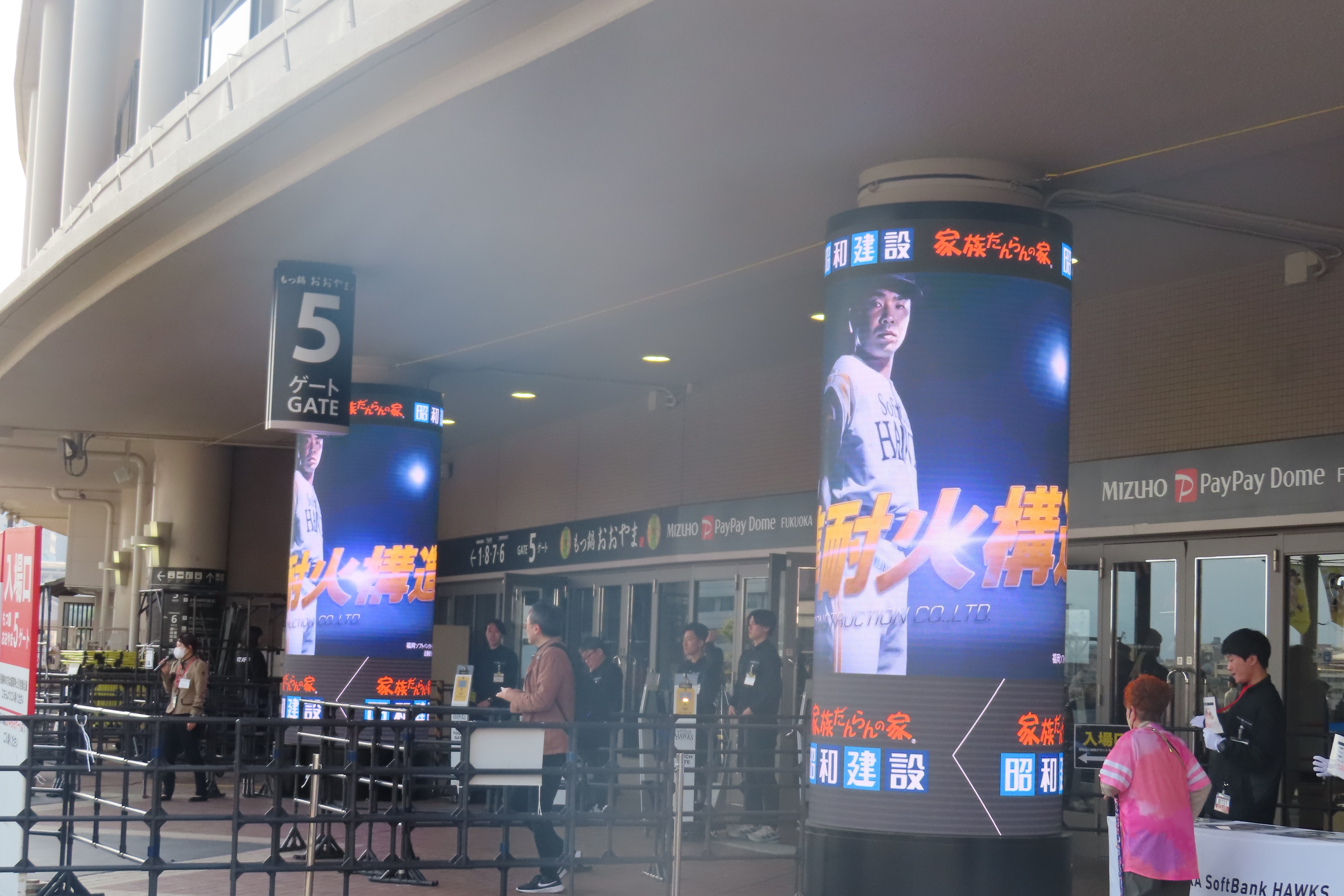 みずほPayPayドームの入り口ゲートの柱には、大型のLEDサイネージが設置されています。静止画や動画で広告を掲出できるため、通りかかる来場者の目を強く引きつけることができます。