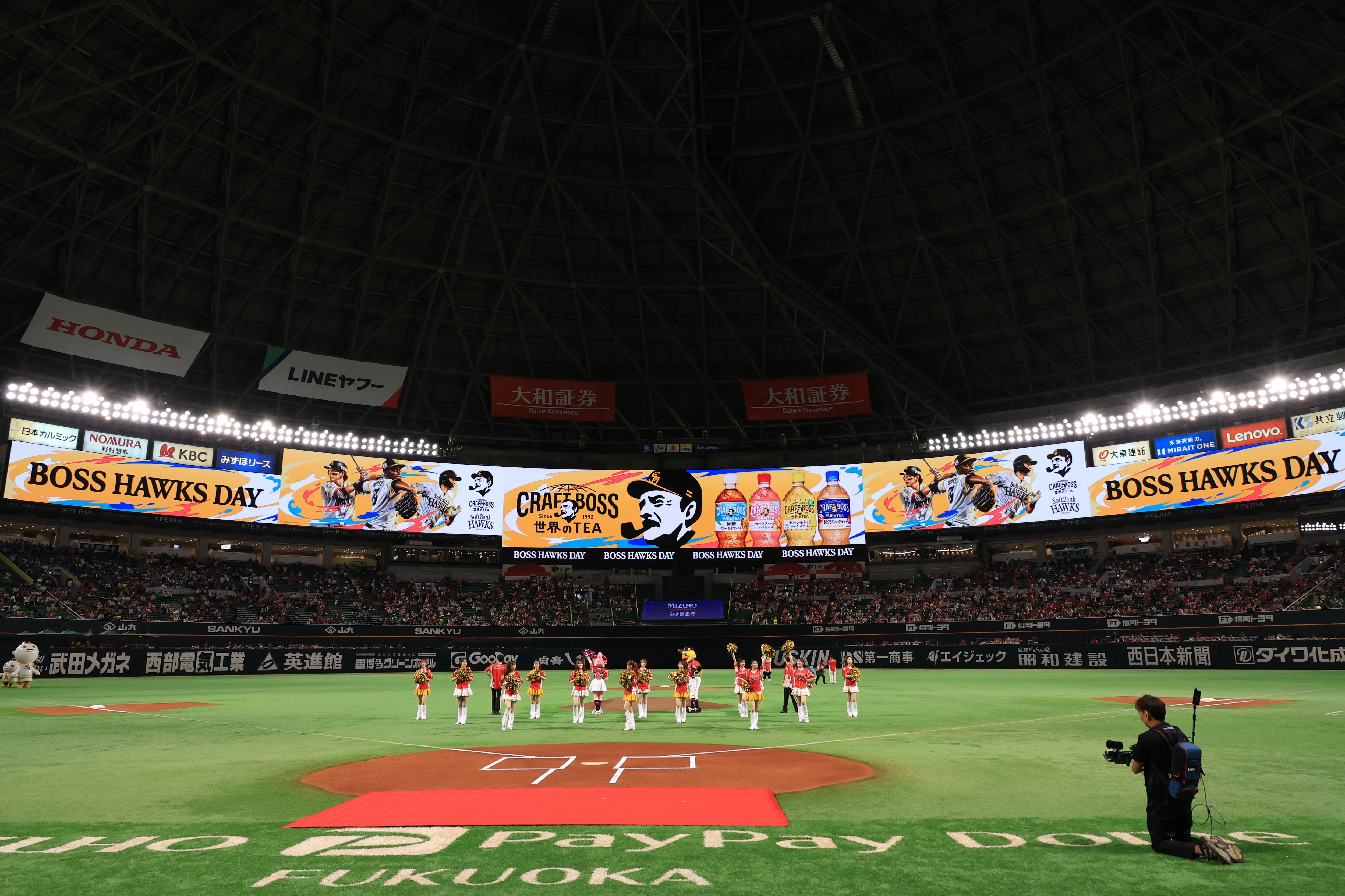 みずほPayPayドームで開催される試合の5回や7回のイニング間では、社名が記載された車が登場し、球場全体を盛り上げています。みずほPayPayドームを象徴する演出となっており、イニング間の社名の露出にて認知度向上につなげています。