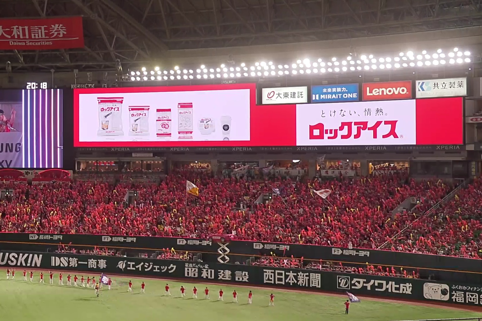 2025年の鷹祭 SUMMER BOOSTで、みずほPayPayドームの大型ビジョンに「ロックアイス」の広告を掲出しました。 氷の「溶けにくさ」と、ホークスファンの「決して熱が冷めない応援スタイル」をリンクさせたメッセージも発信されています。鷹祭 SUMMER BOOST期間の暑い商品の露出により購買意欲を刺激するだけでなく、スポーツの感動と共にブランドスローガンをファンの心に刻む取り組みです。