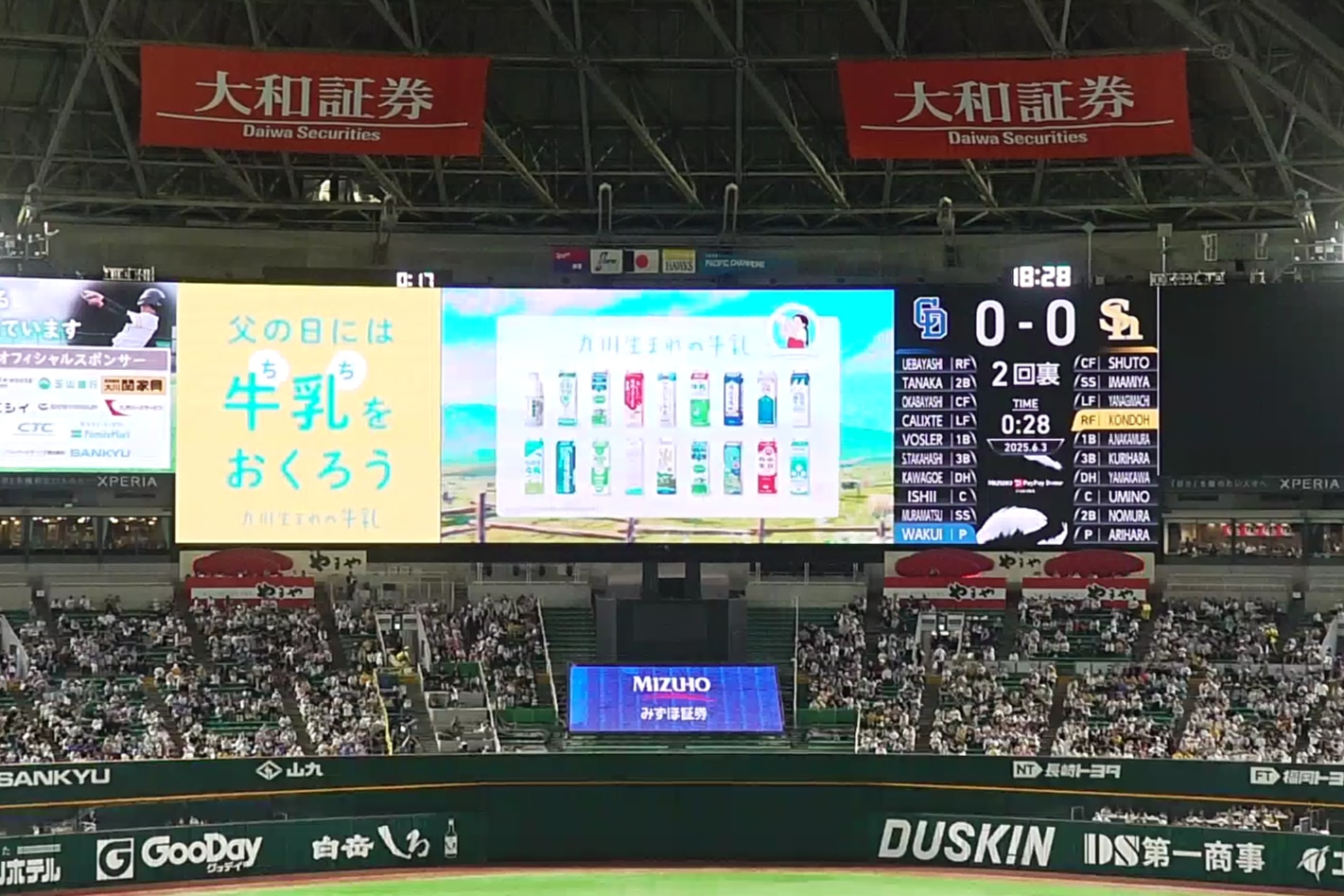 みずほPayPayドームのセンタービジョンにてCMを放送しています。6月の「父の日」に合わせた販促コピーを盛り込むことで、商品の購買をダイレクトに後押しする戦略的なPRを実施しました。当日みずほPayPayドームを訪れた約4万人もの来場者へ、九州生まれの牛乳18種類の魅力を広くアピールされました。