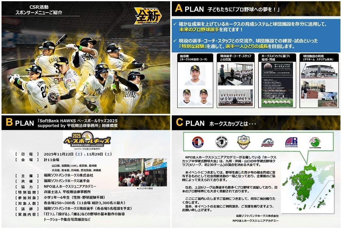 企業イメージの向上に繋がる「ジュニアチーム協賛」・「ベースボールキッズ」・「ホークスカップ」についてご確認できます。