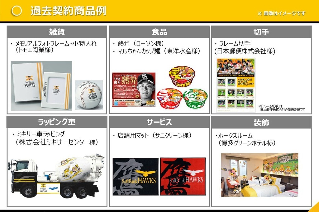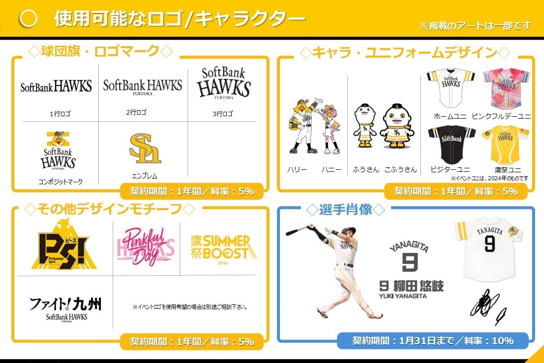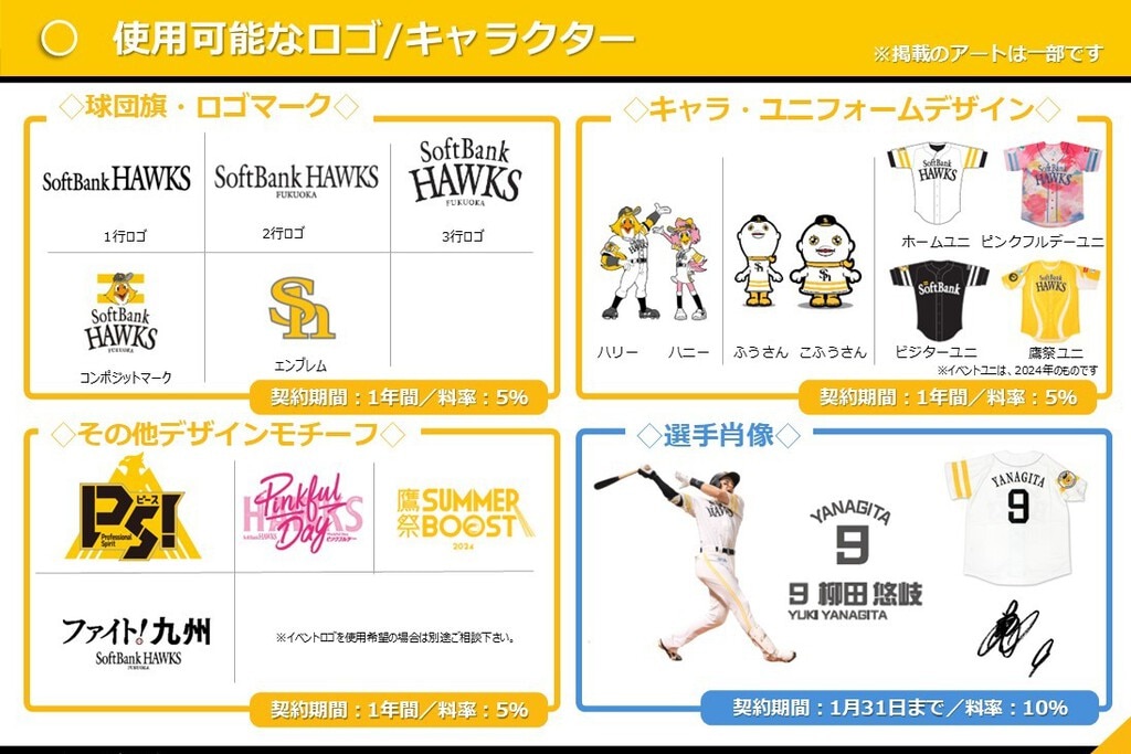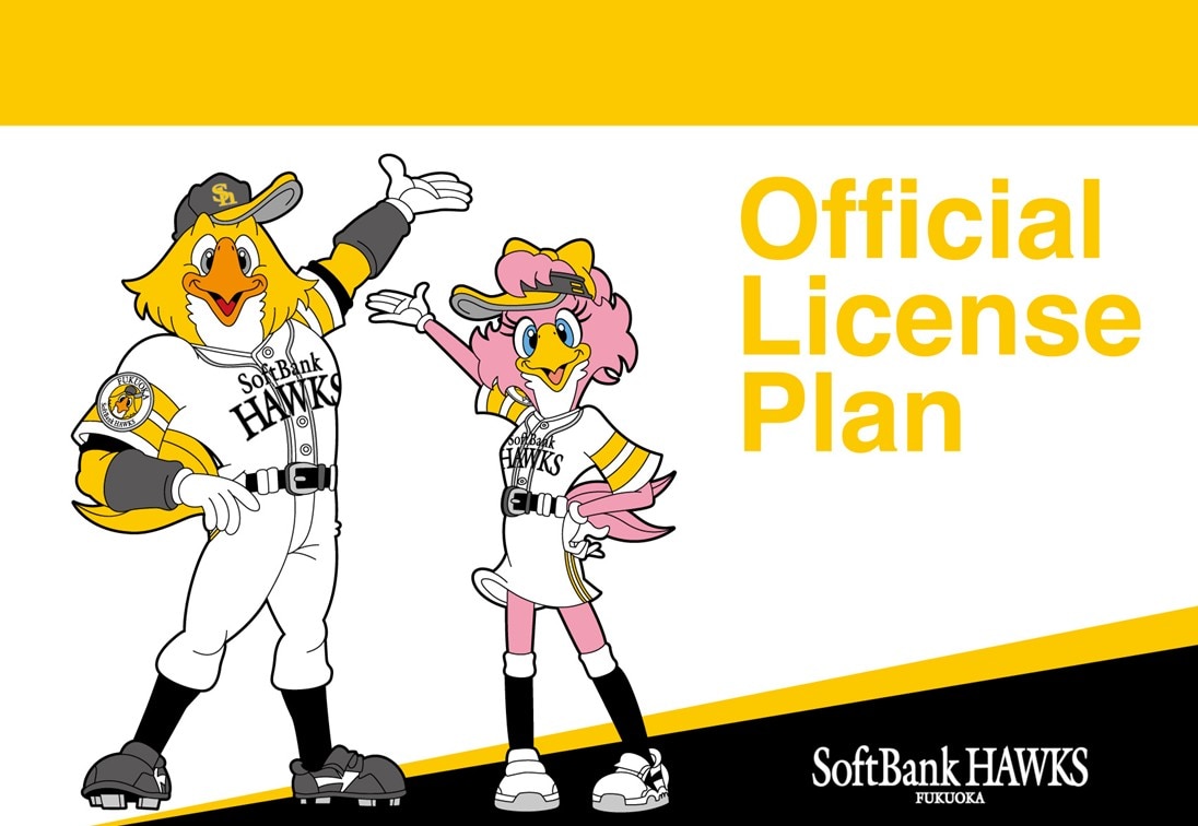 ライセンス契約を締結いただくことで、福岡ソフトバンクホークスの球団ロゴ、マスコット、選手肖像などを使用した商品を制作・販売いただけます。