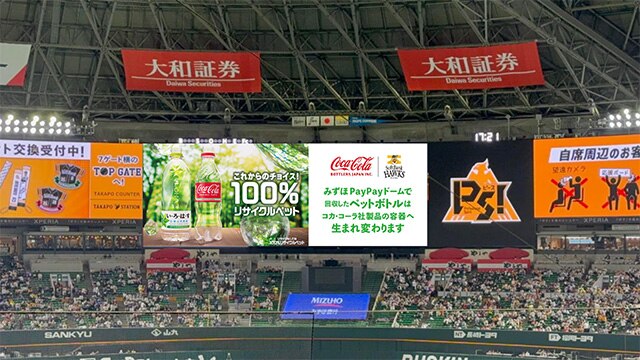 「ボトルtoボトル」に向けた取り組みは、みずほPayPayドーム内のリサイクルボックスや売店から回収された使用済みPETボトルを再原料化し、コカ・コーラ ボトラーズジャパンのPETボトル製品の容器として再生するものです。
