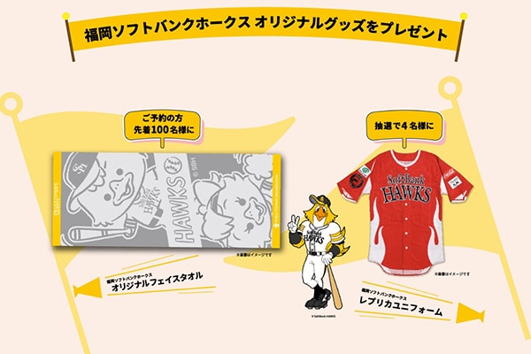お申し込み先着100名にソフトバンクホークス オリジナルフェイスタオルをプレゼント!さらに、ダブルチャンスとして抽選で福岡ソフトバンクホークス レプリカユニフォームが4名に当たります!